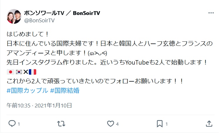 「ボンソワールTV」は、旦那さんの「玄徳」さんとフランス人の奥さん「アマンディーヌ」さんの夫婦が配信するYouTubeチャンネルです。